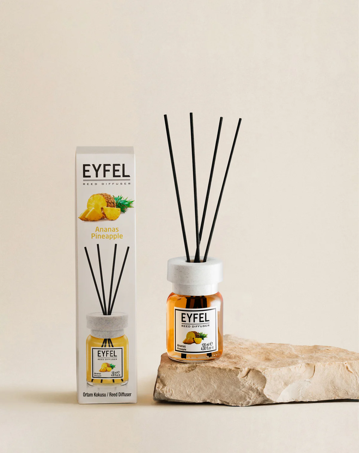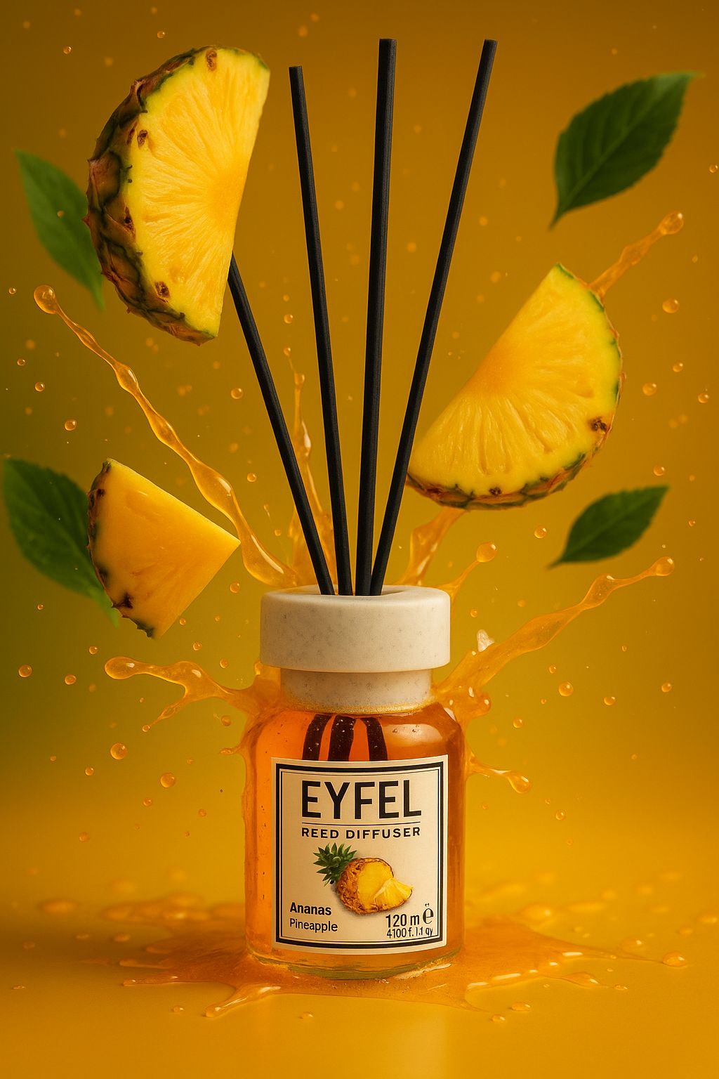 Bring the light and lively scent of tropical summer into your home with the Eyfel Pineapple room air freshener! This scent captures the juicy and spicy aroma of ripe pineapple, creating a refreshing and cheerful atmosphere at the same time. Choose and experience the fresh and liberating scent of the juicy fruit of the tropical islands!